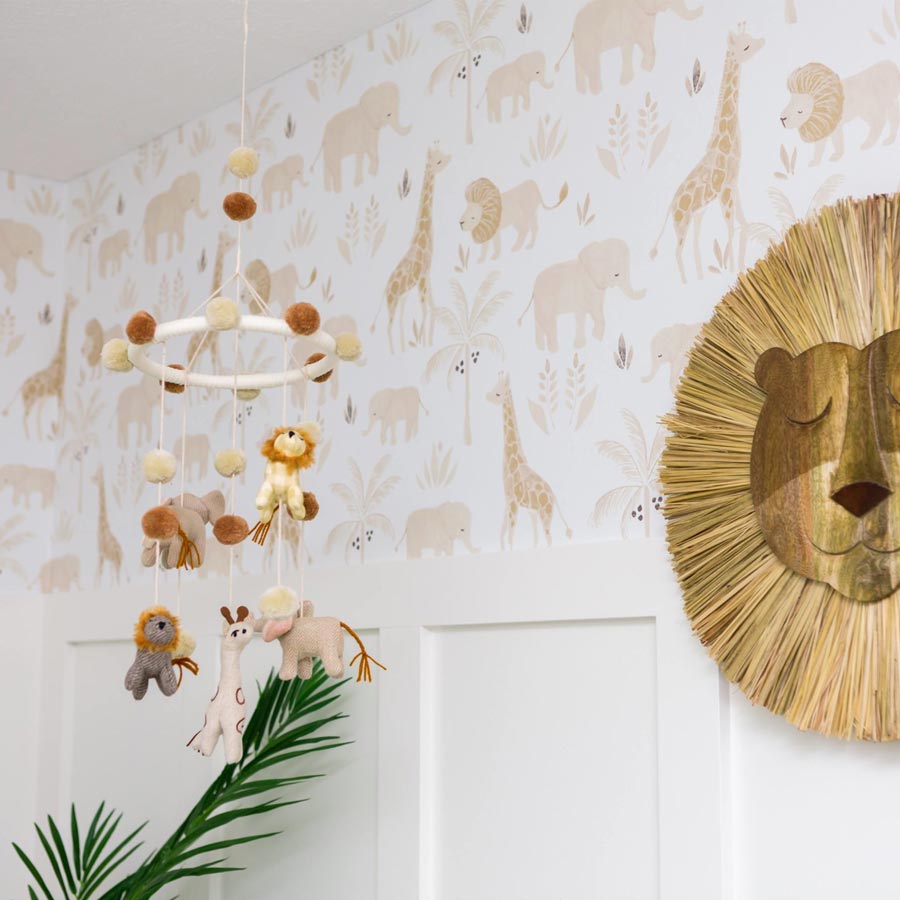 Featuring charming safari animals along with neutral-colored accents.