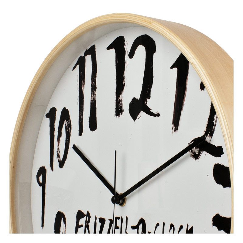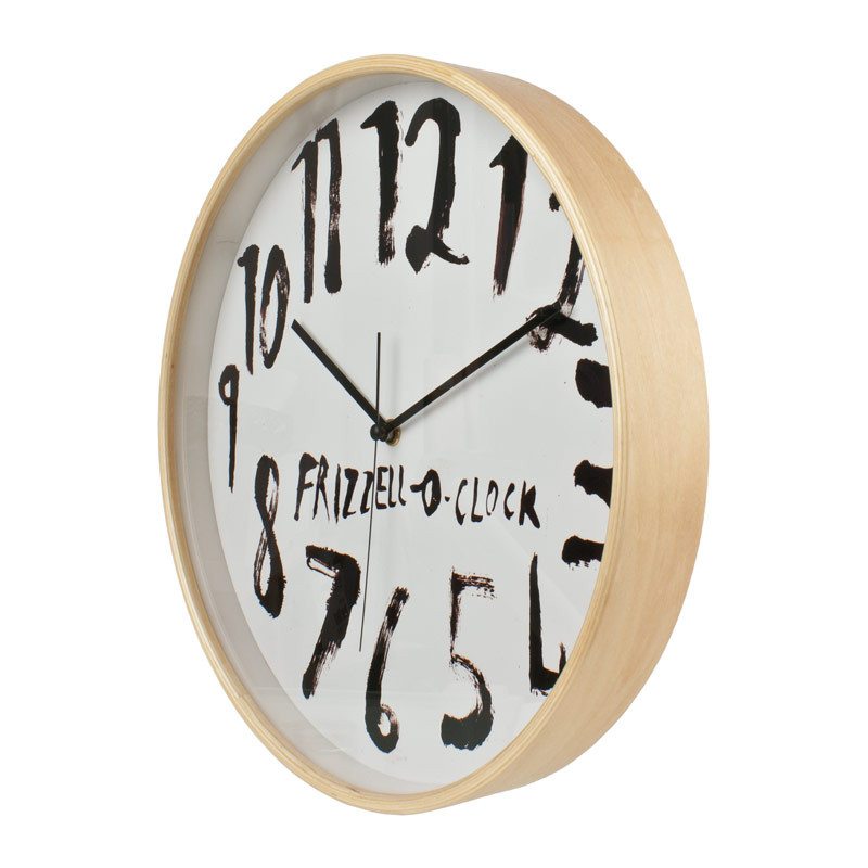 Exclusive print design by Dick Frizzell in his custom typeface, this premium quality clock features a silent movement with a blonde wood frame and glass front.