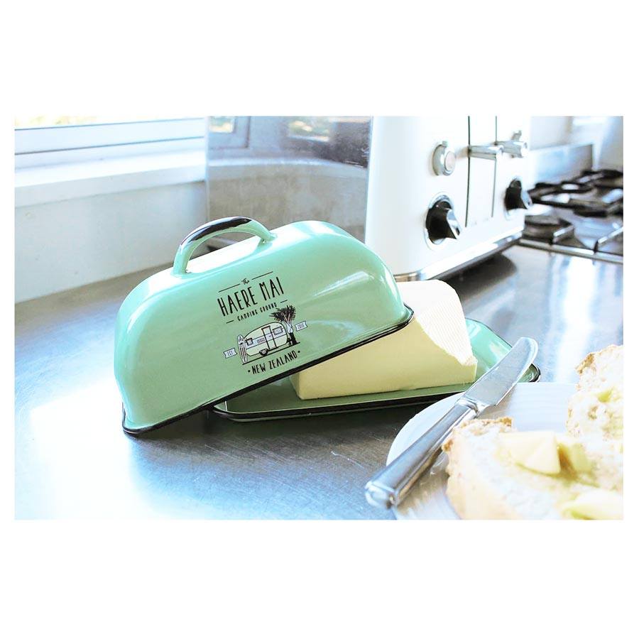 Keep your butter contained in this retro green enamel butter dish featuring a cool new Zealand design.