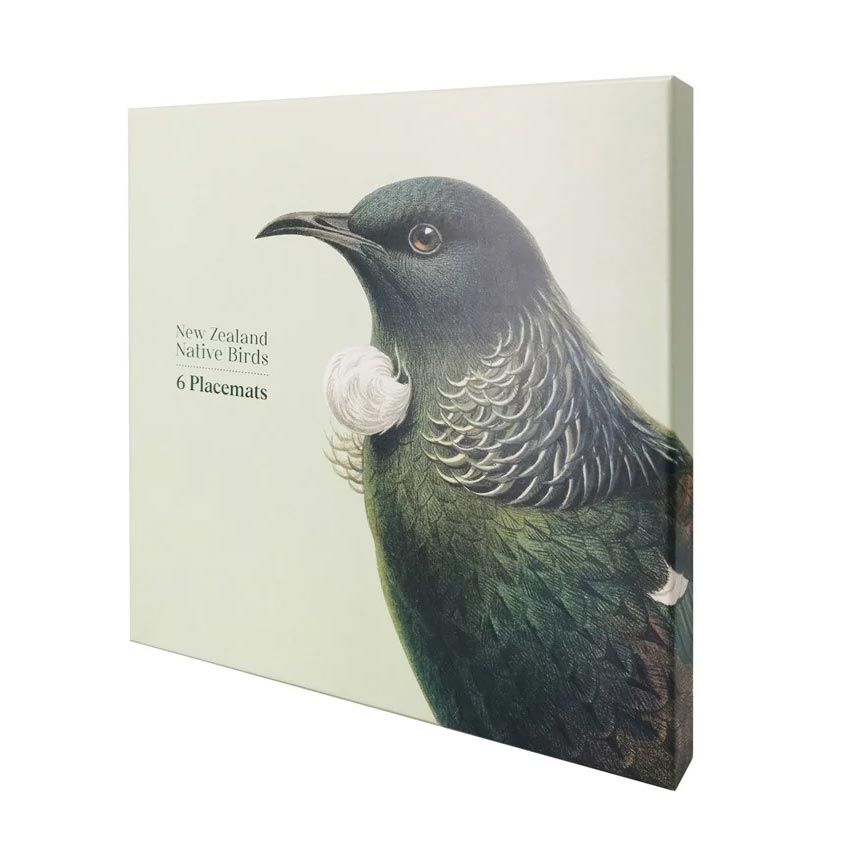 A beautiful boxed set of 6 placemats featuring featuring six of our beautiful NZ native birds: Tui, Kapapo, Kingfisher, Kereu, Huia & Takahe.