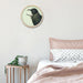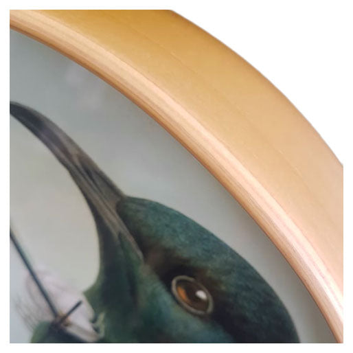 The clock features a beautiful Tui on a soft mint background, black hands and a blonde wood frame with glass front.
