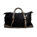 The exterior features a black canvas with vegan leather accents, carry handles and adjustable side straps.