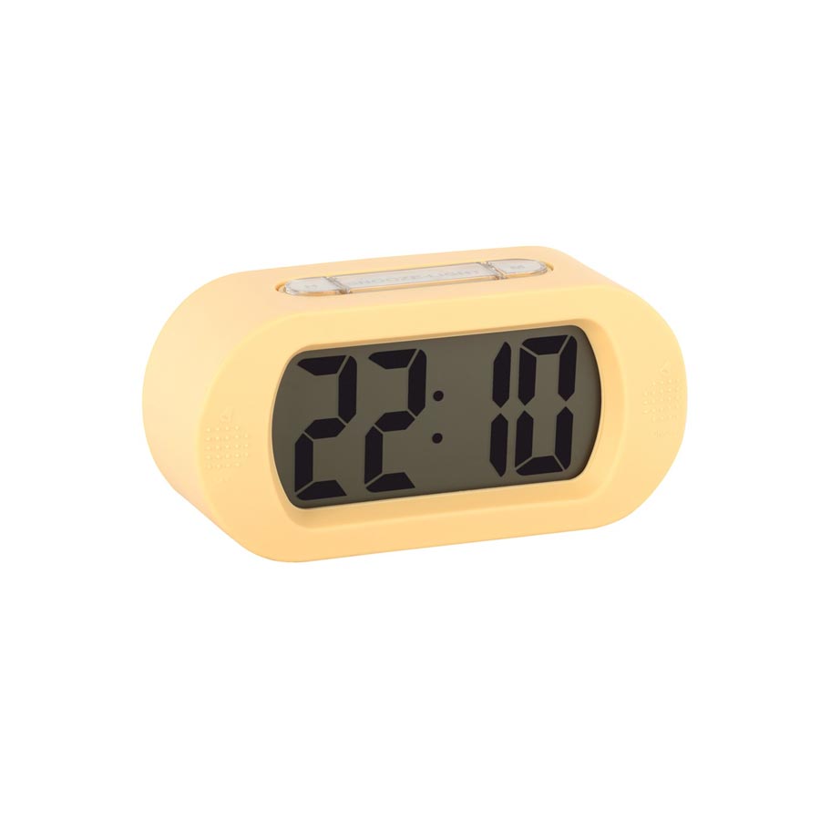 Fall asleep in peace with this soft yellow alarm clock featuring a retro inspired rounded shape, rubberised outer body and digital display.