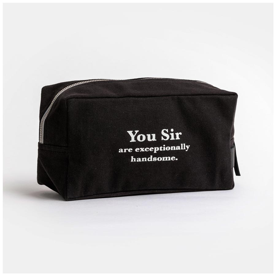 Travel in style using this men’s toilet bag featuring the saying "You Sir are exceptionally handsome". Nicely sized, it will fit all the manly travel essentials.