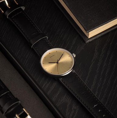 Karlsson Women's Finesse Gold WatchWomen's watch with a black leather strap, gold dial and black casing. Approx Size: 32mm Diameter.Includes 2nd le...