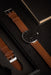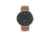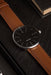 Men's watch with a chocolate tan leather strap, black dial and silver casing.