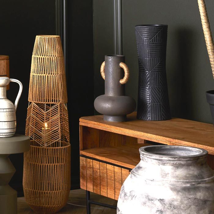It has a long silhouette with arching arms, making it stylish and practical. And the speckled design with an accent of jute string adds a rustic charm.