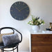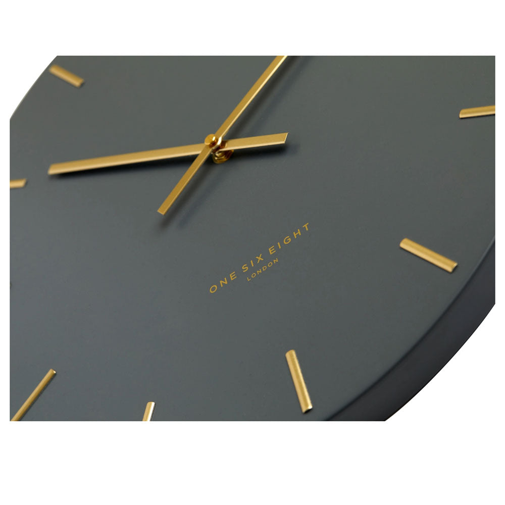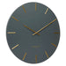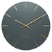This large clock features a pressed metal construction with a charcoal dial and is adorned with luxe gold markers and gold hands.
