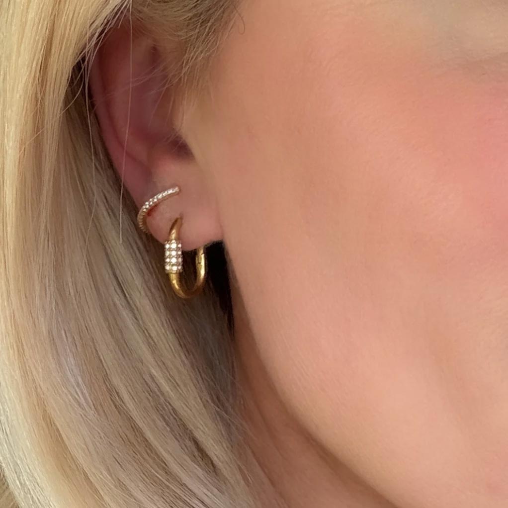 The Eden Hoops feature a stunning pave set zirconia band on thick 18k gold plated sleeper. Perfect for everyday on their own or worn as part of a stack.Β