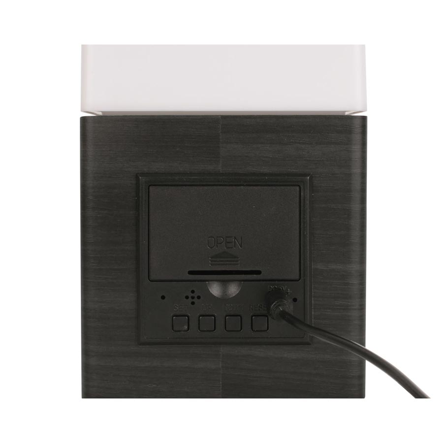 The dark blackened wood veneer gives the alarm clock a modern touch while the built in frosted light adds a handy bedside feature.