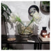 The handmade rustic iron stand holds a heavy hand-blown green tinted glass bowl vase.