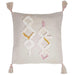 A beautiful textural cushion with corner tassels and a hint of mustard yellow, cream and blush pink.