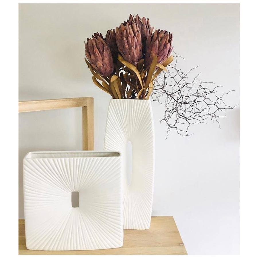 Large square, textured vase with an interesting design. Looks fabulous filled or displayed on its own.Β Β