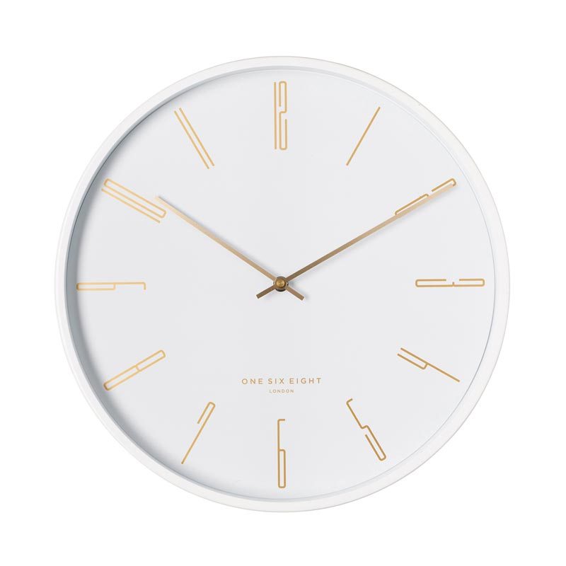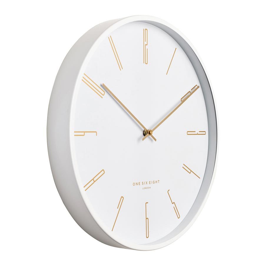 Maya’s beautiful design features a sleek white metal case, white face with coordinating champagne gold hands and number markers.