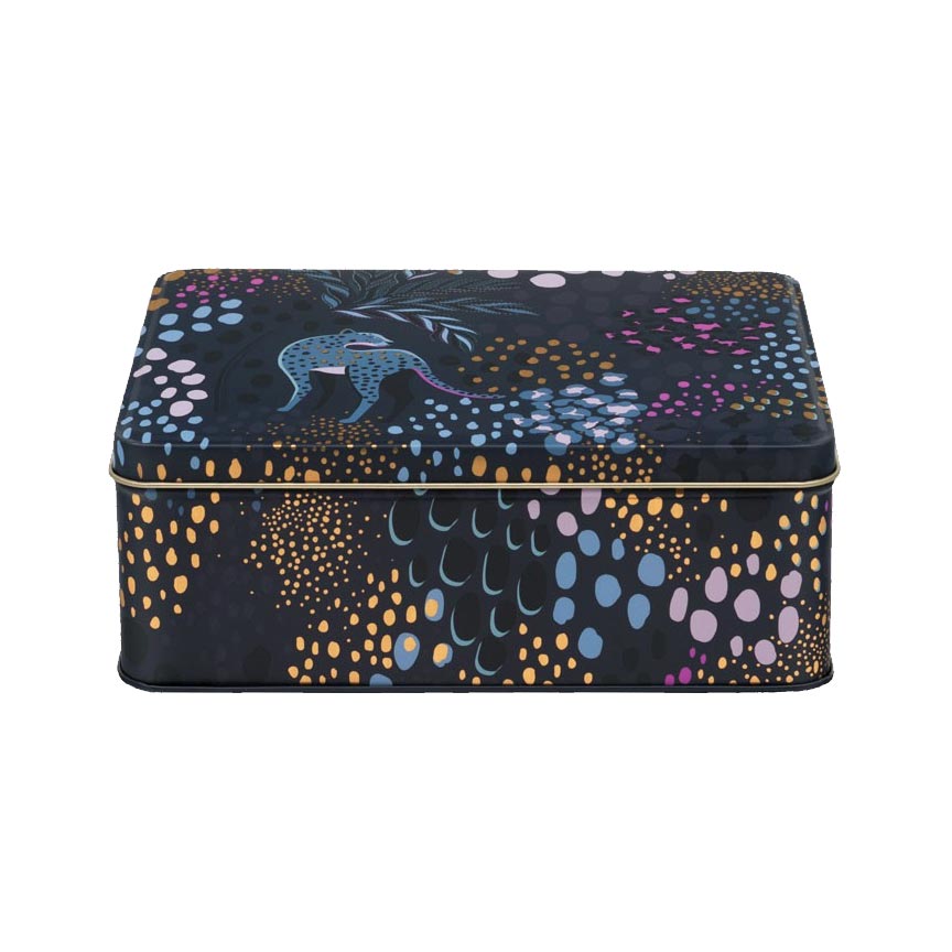 Featuring a sleek Leopard roaming through a midnight setting, this bakery tin from Sara Miller's Savannah Collection will add a striking touch to any home.