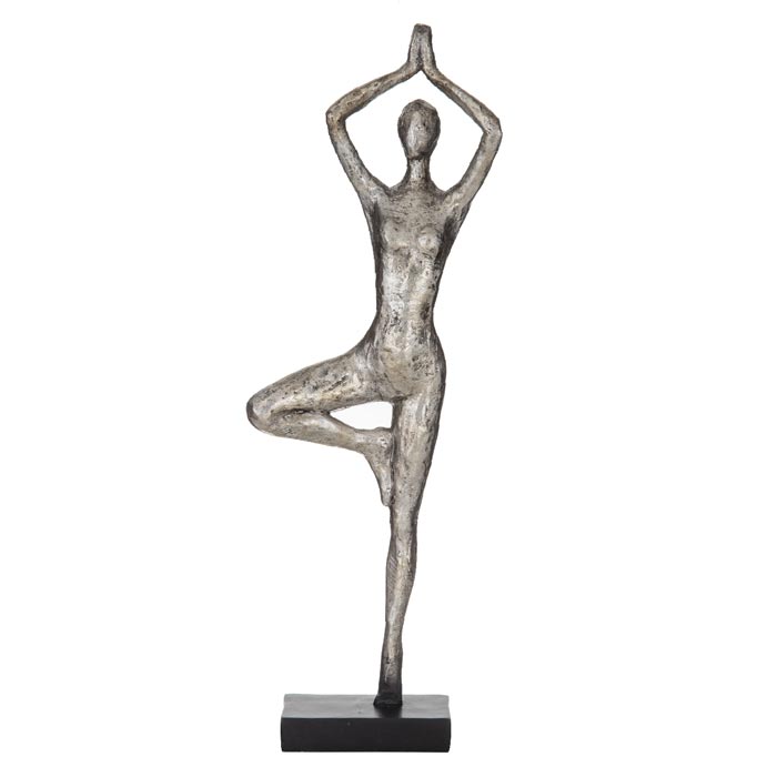 Made from resin with a vintage silver finish, it depicts a decorative yoga-inspired silhouette.