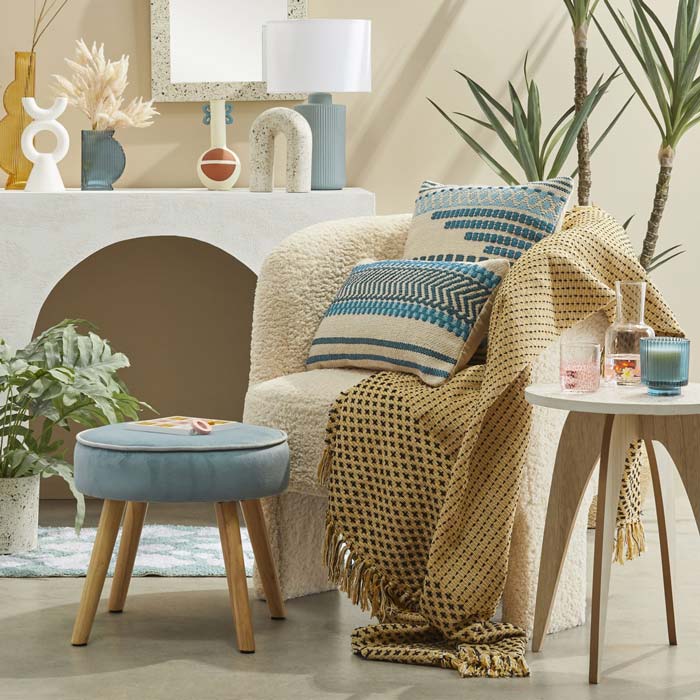 Made from polyester velvet and rubber wood, its beautiful teal blue colour makes it a statement piece.