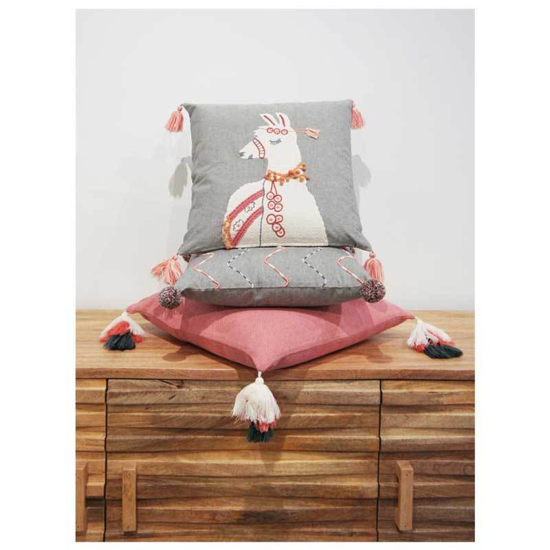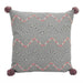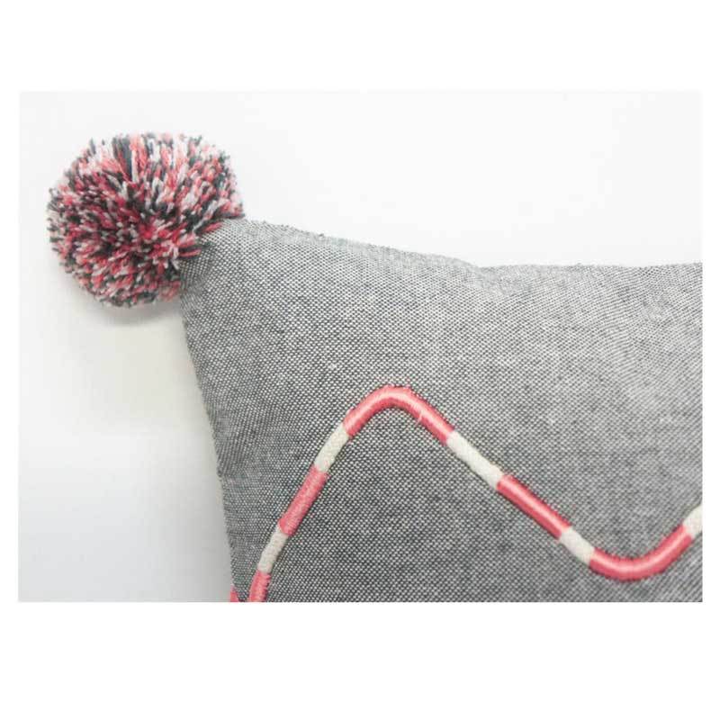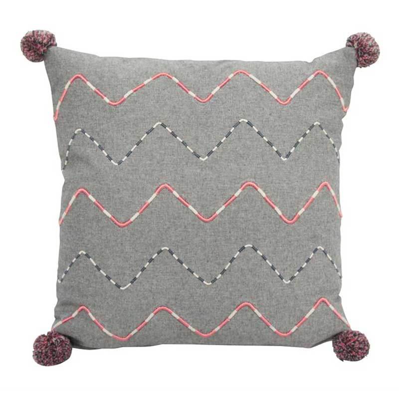 These grey and coral cushion features a fun wavy design and cute corner pom poms.