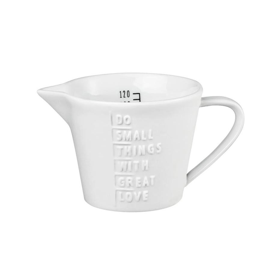 Functional and beautiful, this mini measuring jug is made from porcelain featuring an embossed design that says " Do small things with great love".