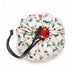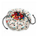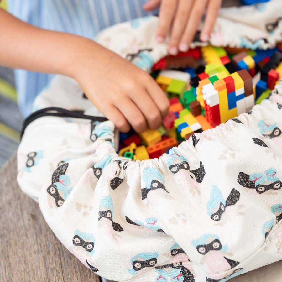 Spread the pouch out for play and when it is time to pack away just pull on the rope and in a jiffy you’ve gathered everything neatly into the storage pouch.