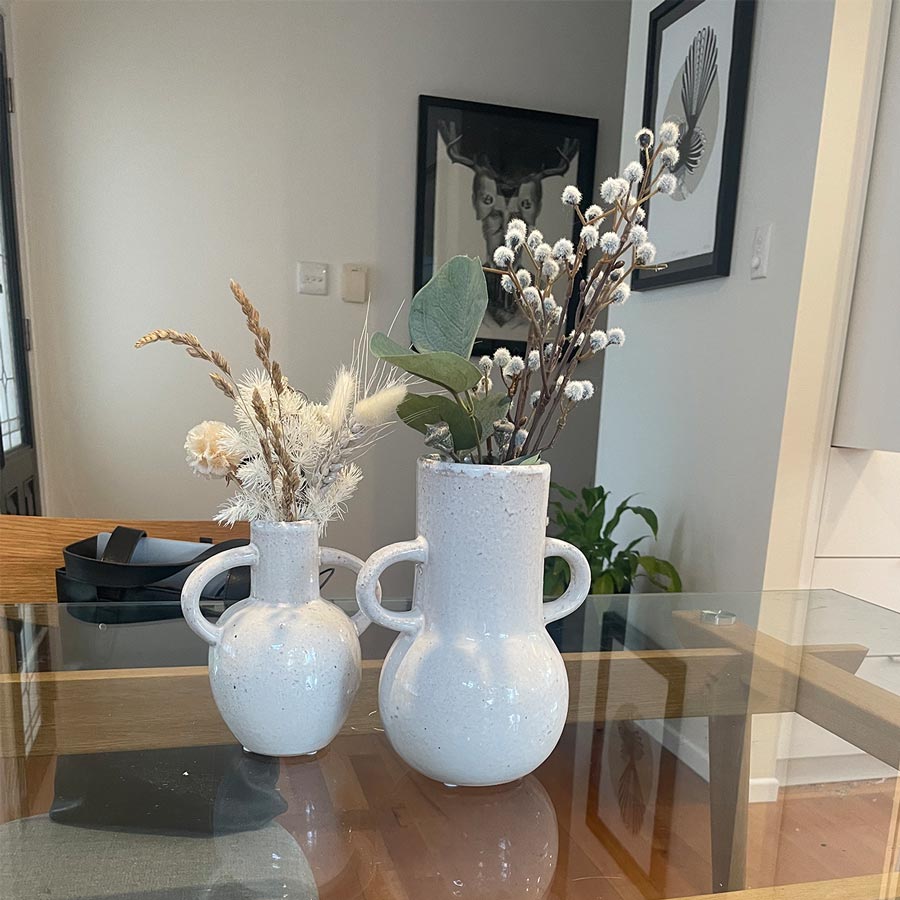 The tilda vessel is handmade from ceramic and has a speckled, an aged vintage natural/white finish. A wonderful addition to your table or mantle.